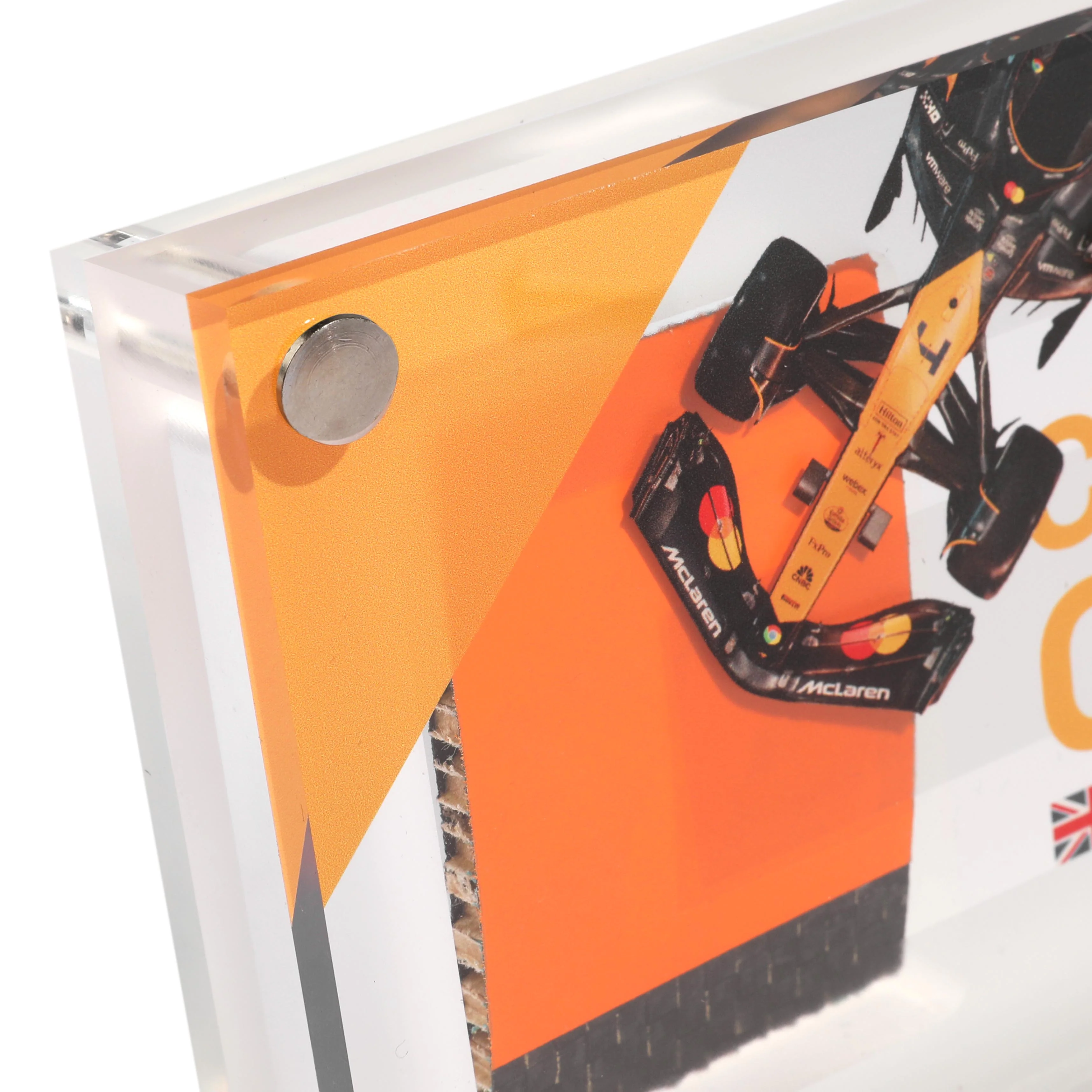 Celebrate this monumental achievement by securing a piece bodywork in a perfect acrylic destined to be displayed with pride on your desk. This acrylic features a real piece of the very cars driven by both Oscar and Lando throughout the 2024 season.