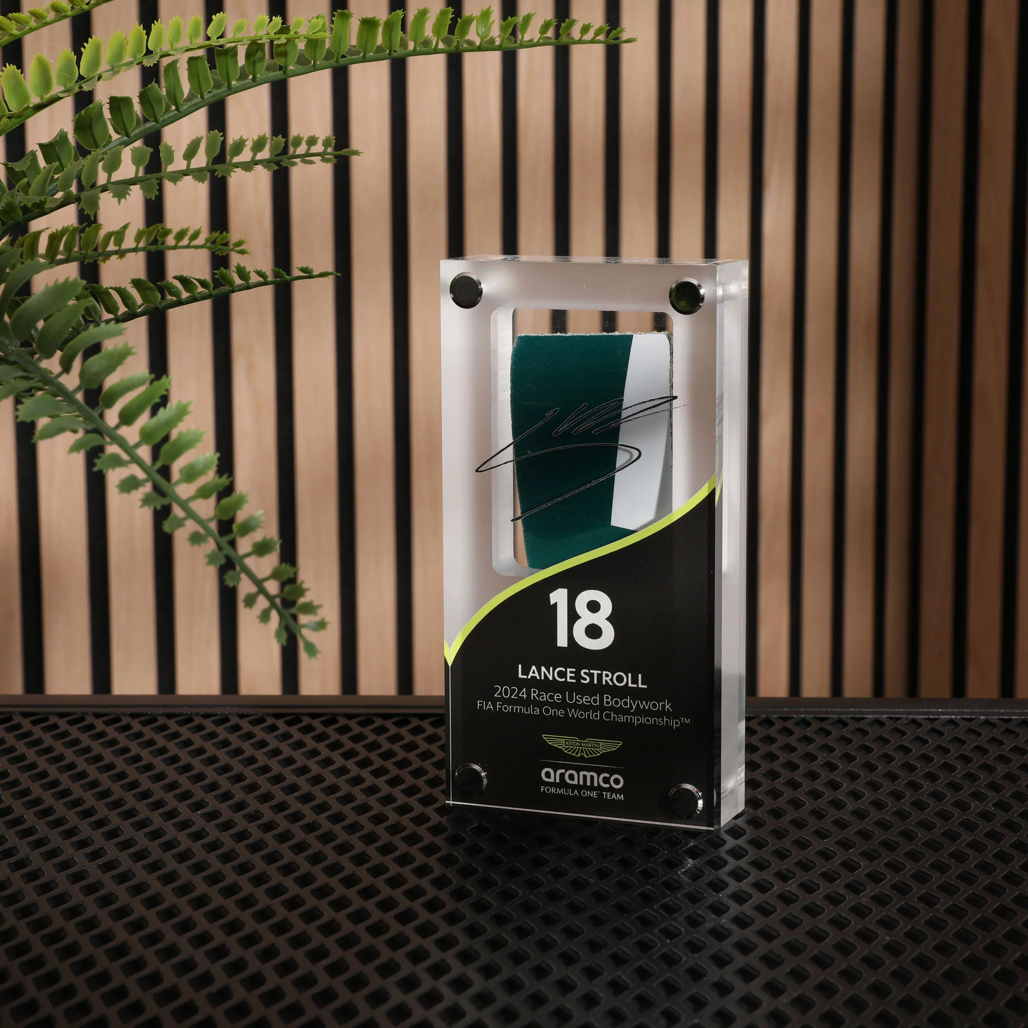 Own an authentic piece of bodywork taken from Aston Martin Aramco F1 Team and celebrate Canadian driver, Lance Stroll. Hand-cut from the race car driven by the racing ace, each piece is unique.Ā